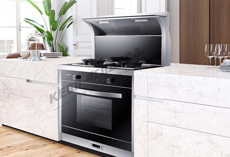 集成環保灶N合為一采用下排式設計,省去上方傳統壁掛式吸油煙機的空間,環保灶廚柜融于一體,安裝飾自由度高,為中島式,開放式的現代廚房提供更多空間。