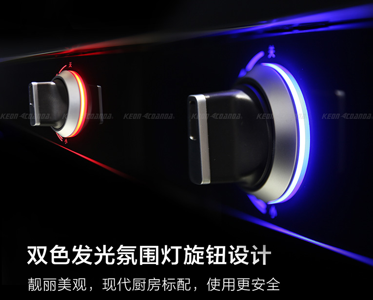 如科恩智能炫彩系列集成灶的推出讓廚房變得更加時尚,時尚酷炫的鈦合金雙色炫彩旋鈕設計,防銹、耐磨、有質感、靚麗美觀。集成灶開啟電源待機狀態時,旋鈕的顏色呈藍色,當集成灶處于點火狀態,旋鈕的顏色呈紅色,這種獨特的設計理念,不僅讓集成灶整體增加的科技感,同時更是增加了一道安全防護,僅需一眼便能識別集成灶處于什么狀態!