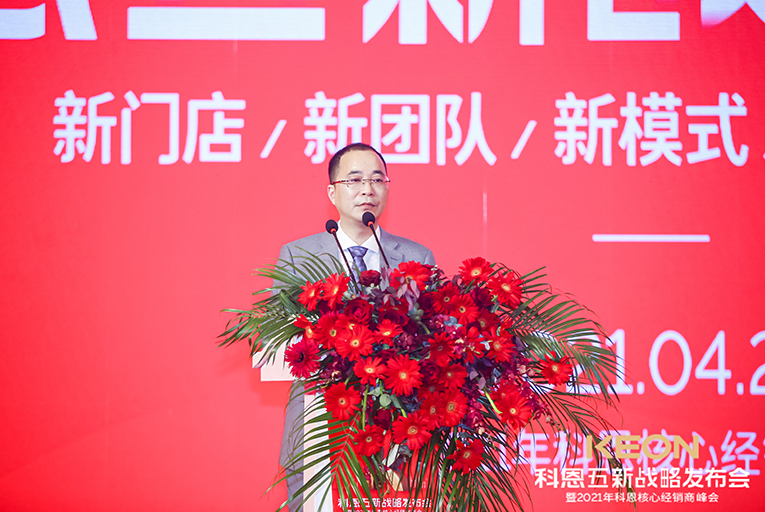 一場(chǎng)震撼全場(chǎng)的沙畫表演后正式會(huì)議正式開(kāi)始,科恩電器董事長(zhǎng)俞鋒率先上臺(tái)致辭,首先對(duì)現(xiàn)場(chǎng)所有人表達(dá)了誠(chéng)摯的感謝。2021年科恩電器將乘風(fēng)破浪拉開(kāi)新帷幕,開(kāi)啟全新篇章。隨后,科恩電器營(yíng)銷總經(jīng)理趙漢斌發(fā)布“五新戰(zhàn)略”:新門店、新團(tuán)隊(duì)、新模式、新目標(biāo)、新未來(lái)!不忘初心,方得始終,一起開(kāi)創(chuàng)新時(shí)代、新征程!