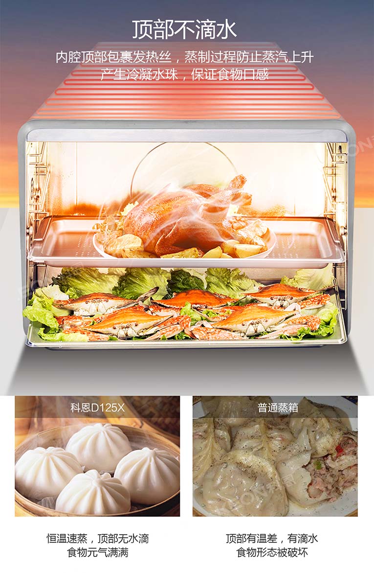 集成灶十大品牌、廚電行業十大品牌科恩集成灶內置十大烹飪模式,溫度、火候、時間自由掌控,廚房小白輕松蒸出美味健康食物。另外,“蒸”就怕的就是有水進入到食物里面去了,那樣的話食物就會變味,科恩集成灶就不會發生這樣的情況。4D噴氣式蒸烤,頂部也不漏水,蒸出來的食物就是原汁原味,口感更是能夠促動你的味蕾。