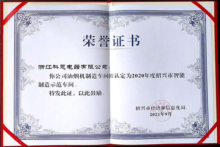 進一步強化標桿示范引領,全面提升企業“新智造”水平,2020年度紹興市傳統產業智能化改造項目申報和評審認定工作開展,經企業申報、各地初審、資料審閱、現場踏勘等環節,浙江科恩電器有限公司油煙機車間榮獲“2020年度紹興市智能制造示范車間”。