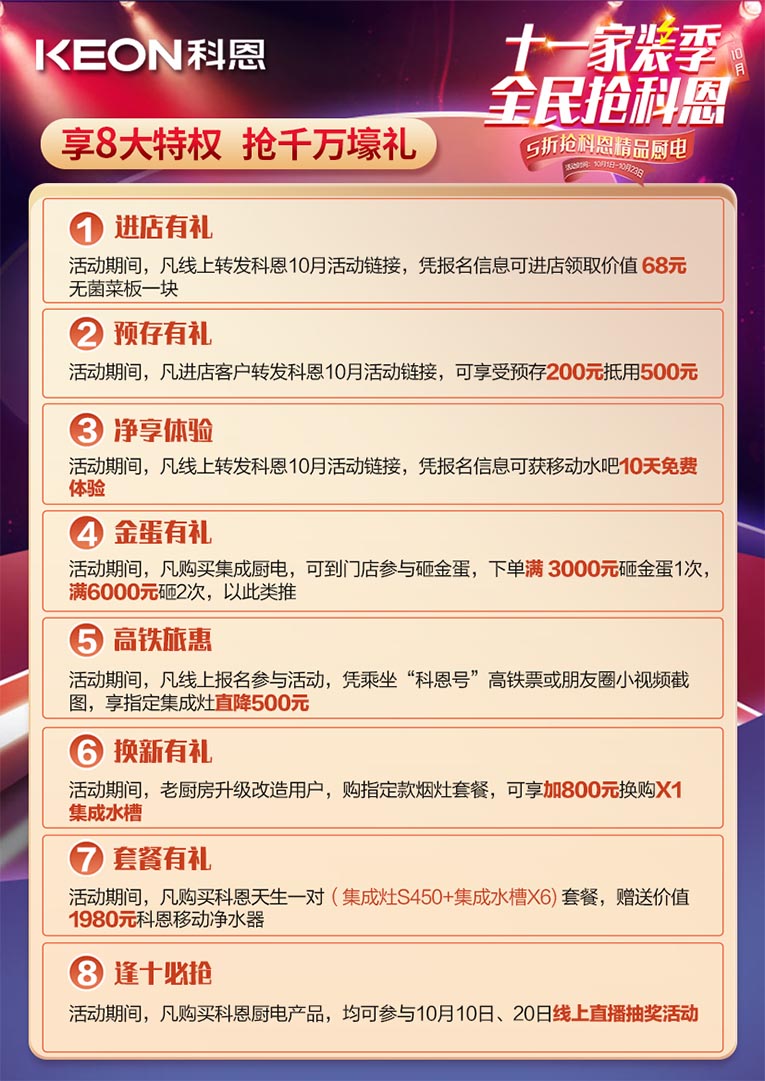 除此之外,集成灶十大品牌、廚電行業十大品牌科恩十一家裝季全民搶科恩,8大特權壕禮限時放送,特權一進店有禮:凡線上轉發科恩10月活動鏈接,憑報名信息可進店領取價值68元無菌菜板一塊;特權二預存有禮:凡進店客戶轉發科恩10月活動鏈接,可享受預存200元抵用500元;特權三凈享體驗:活動期間,凡線上轉發科恩10月活動鏈接,憑報名信息可獲移動水吧10天免費體驗;特權四金蛋有禮:活動期間,凡購買集成廚電,可到門店參與砸金蛋,下單滿3000元砸金蛋1次,滿6000元砸2次,以此類推;特權五高鐵旅惠:活動期間凡線上報名參與活動,憑乘坐“科恩號”高鐵票或朋友圈小視頻截圖,享指定集成灶直降500元;特權六換新有禮:活動期間,老廚房升級改造,購指定款煙灶套餐,可享加800元換購X1集成水槽;特權七套餐有禮:活動期間,凡購買科恩天生一對(集成灶S450+集成水槽X6)套餐,贈送價值1980元科恩移動凈水器;特權八逢十必搶:活動期間,凡購買科恩廚電產品,均可參與10月10日、20日線上直播抽獎活動。