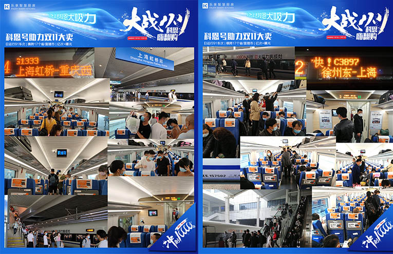 走進“科恩號”車廂,從天幕、海報、電子屏到小桌板,都是來自科恩集成灶的霸屏推送。