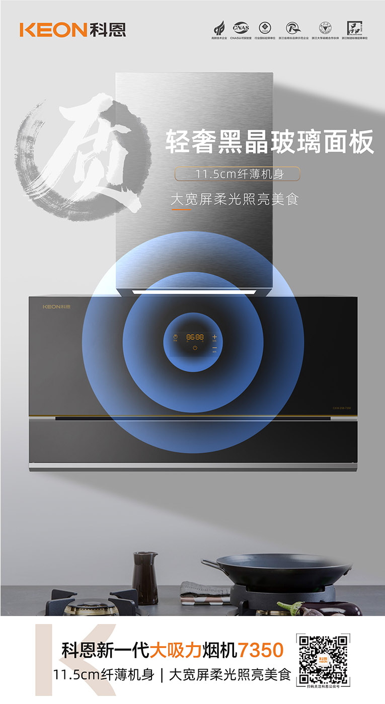 集成灶十大品牌、廚電行業(yè)十大品牌科恩新一代大吸力煙機7350采用靠墻式機身設計,用戶以不同姿勢烹飪時都不怕碰頭,11.5cm纖薄機身,搭配輕奢黑晶玻璃面板,持久耐腐蝕,使用不留指紋,污漬一擦即凈。