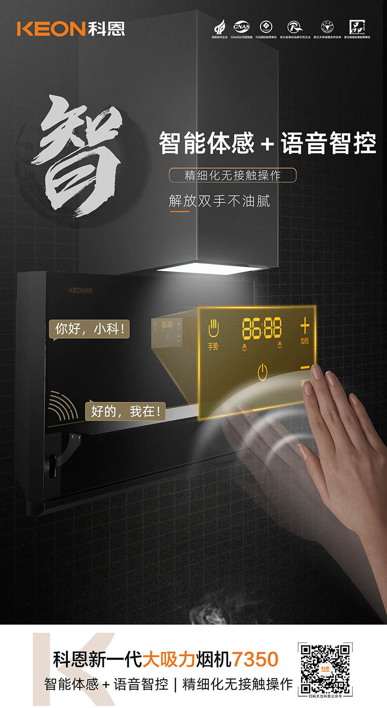 集成灶十大品牌、廚電行業(yè)十大品牌科恩新一代大吸力煙機7350還擁有智能語音控制與體感操控,呼喚“你好小科”可控制煙機。