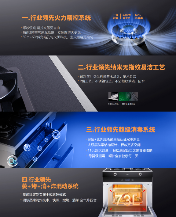 C系列集成灶配備的四項行業領先創新技術:火力精控系統、納米無指紋易潔工藝、超級消毒系統、蒸烤消炸混動系統——直擊當下消費痛點,徹底解決用戶使用需求,從大火力大吸力、易清潔易打理、廣收納懂消殺、多功能全集成四個維度力破當下行業四大頑固堵點。