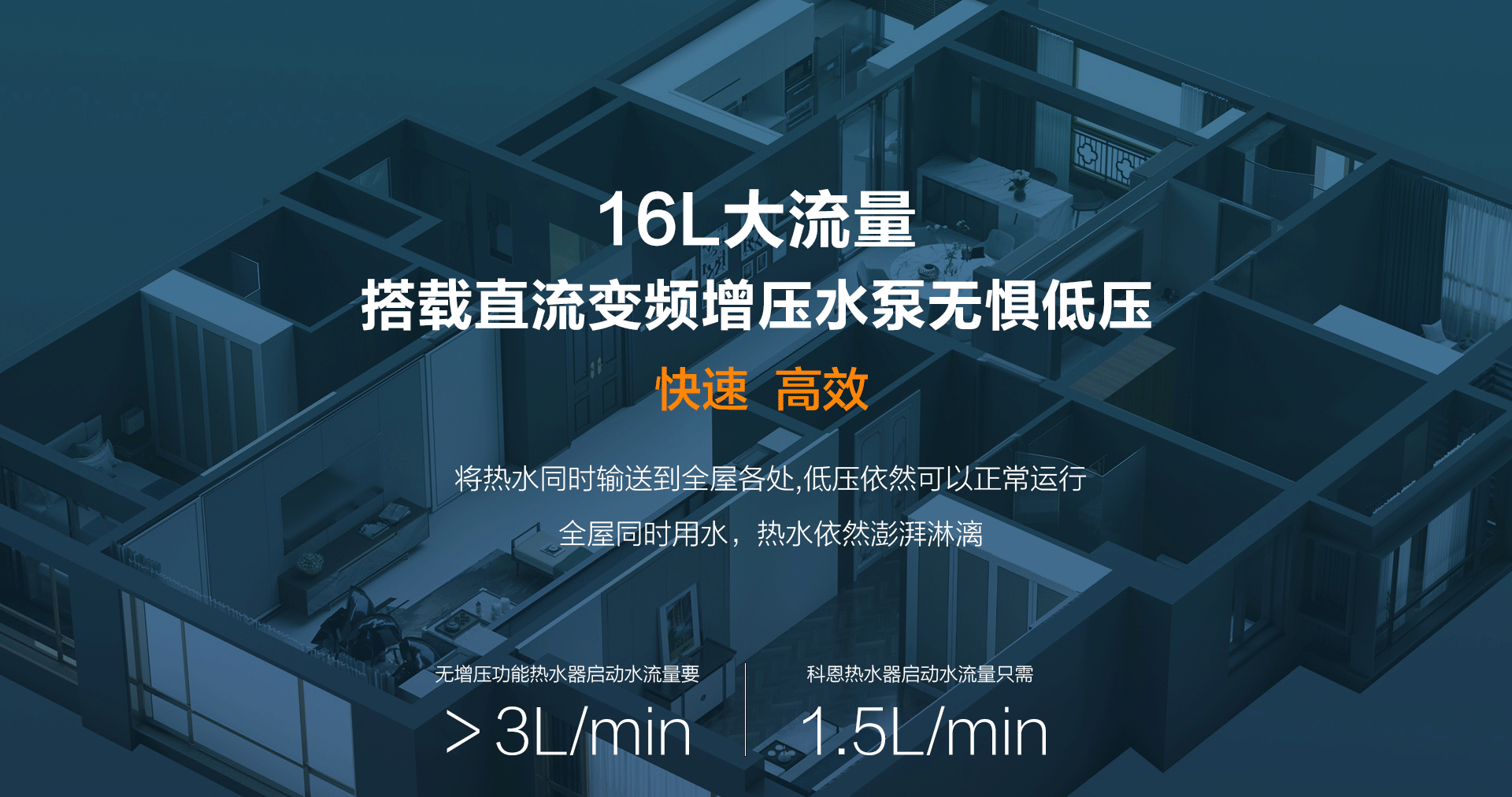 智能增壓,快速高效:16L大流量搭載直流變頻增壓水泵,根據(jù)風(fēng)壓智能改變轉(zhuǎn)速,將熱水同時輸送到全屋各處,低壓依然可正常運(yùn)行,全屋多點(diǎn)用水,熱水依然澎湃淋漓,出水更快,更有效率,別墅、高層完全不帶怕的。