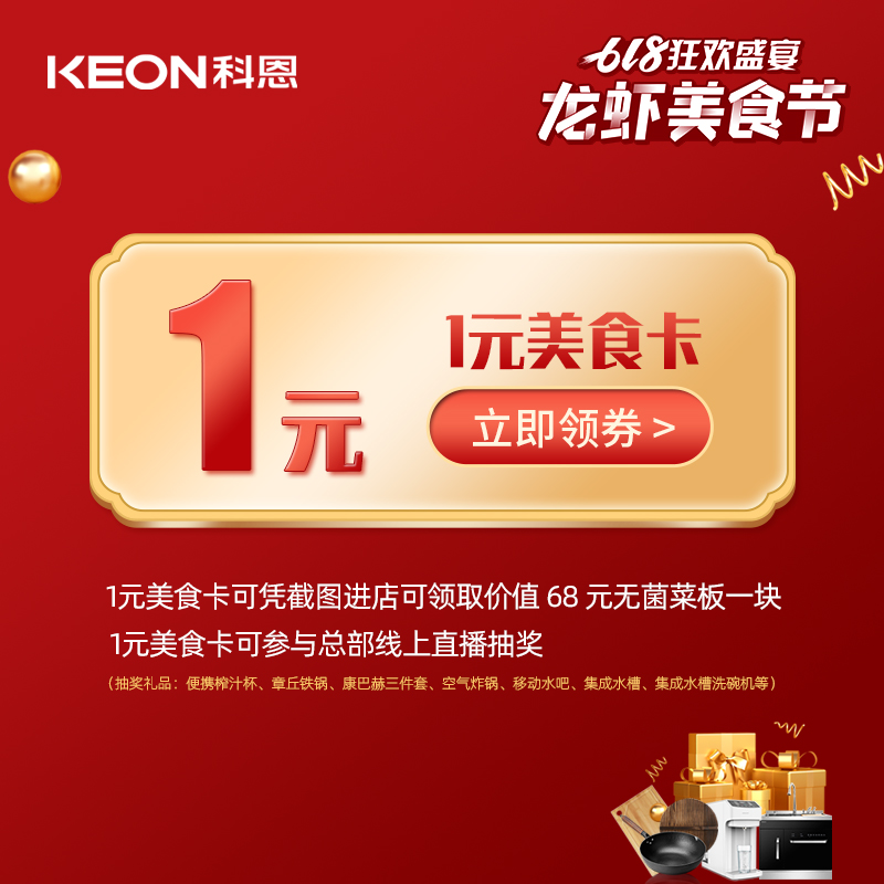 萬(wàn)人品美食,0元搶科恩,5月28日——6月18日,凡購(gòu)買1元美食特權(quán)卡的用戶,即可參與總部線上直播抽獎(jiǎng)活動(dòng):便攜榨汁機(jī)/章丘鐵鍋/康巴赫鍋具三件套/空氣炸鍋/移動(dòng)水吧/集成水槽等/集成水槽洗碗機(jī).1元購(gòu)卡,送價(jià)值68元無(wú)菌菜板,還能獲得直播大抽獎(jiǎng)資格,重磅豪禮有機(jī)會(huì)收入囊中,有沒(méi)有很心動(dòng)?!