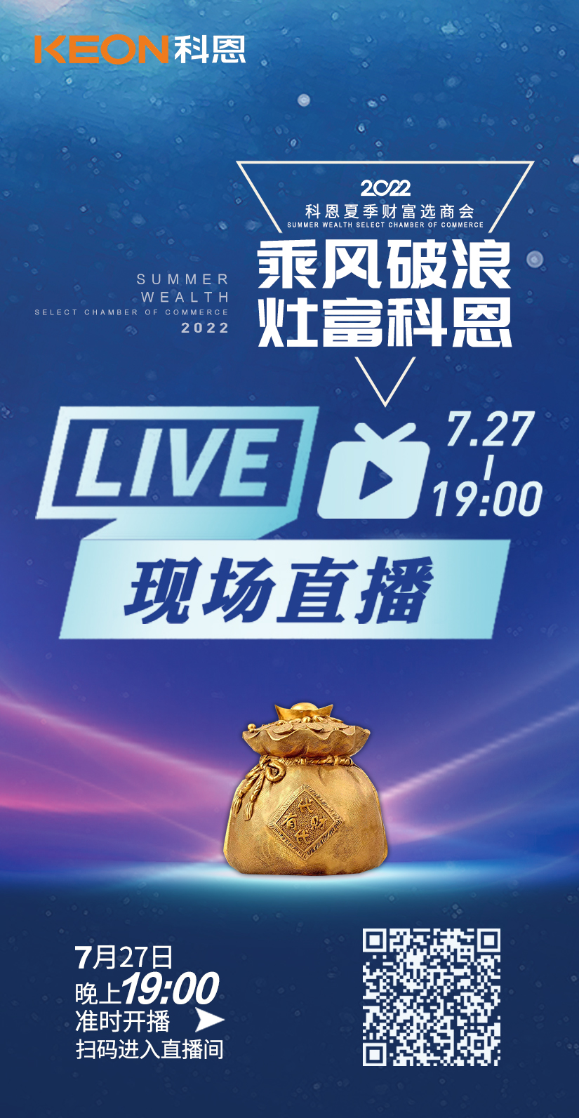 科恩電器具備優于業界的技術、高質量的保證、強大的企業實力、有保障的售后等優勢,2022年7月27日,“乘風破浪,灶富科恩”2022科恩夏季財富選商會,捉住時代機遇,共享藍海財富密碼,讓我們相約線上,共同搶占廚電市場!