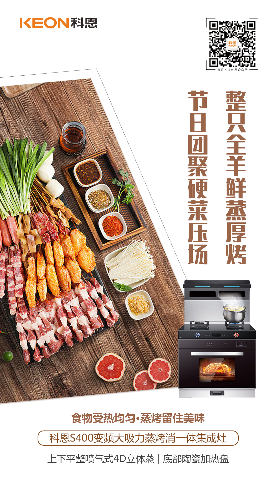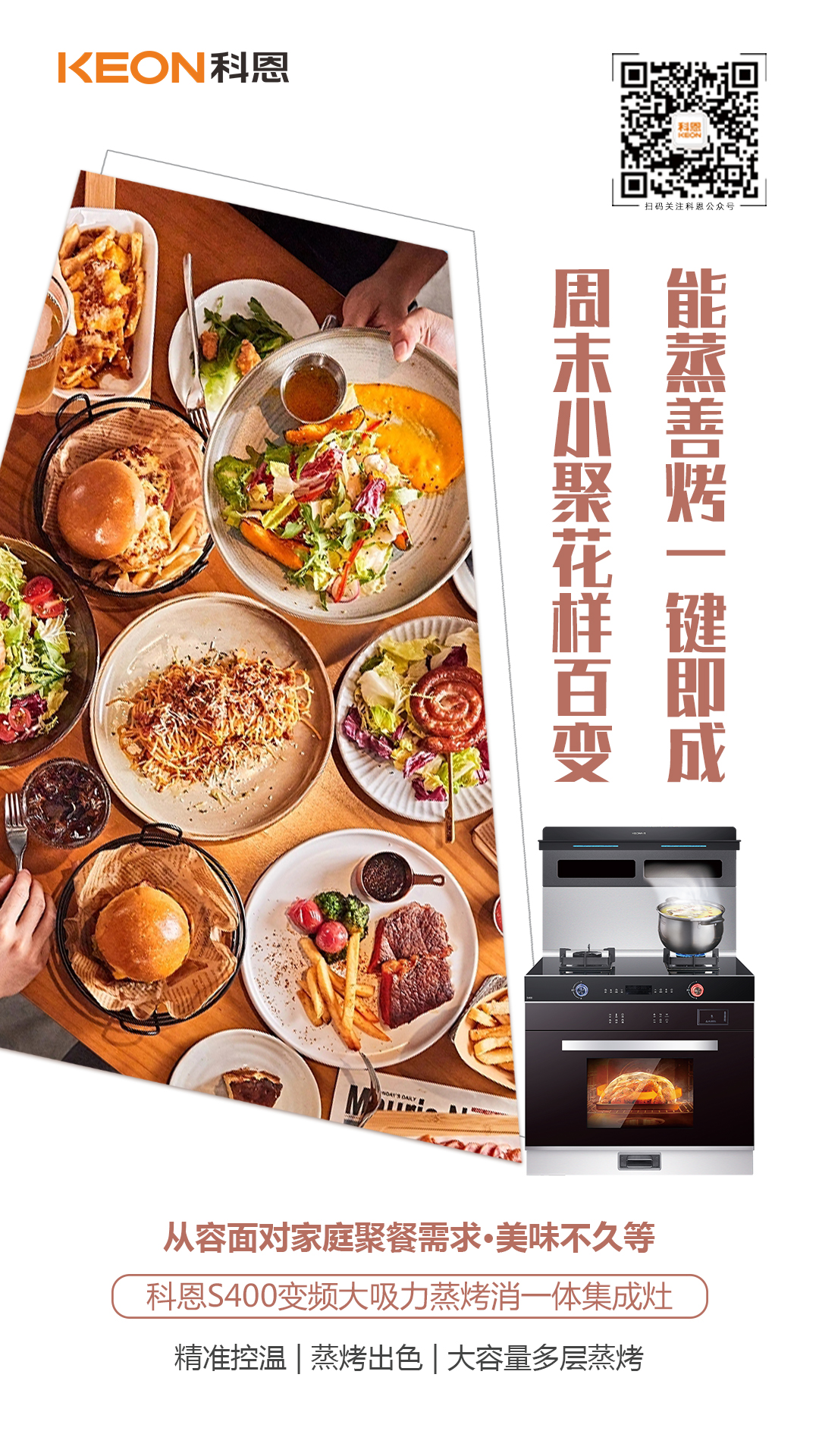 驅散夏日炎熱,讓夏天愛上下廚房,用科恩S400變頻大吸力蒸烤消一體集成灶,文蒸武烤,美味即刻上桌!