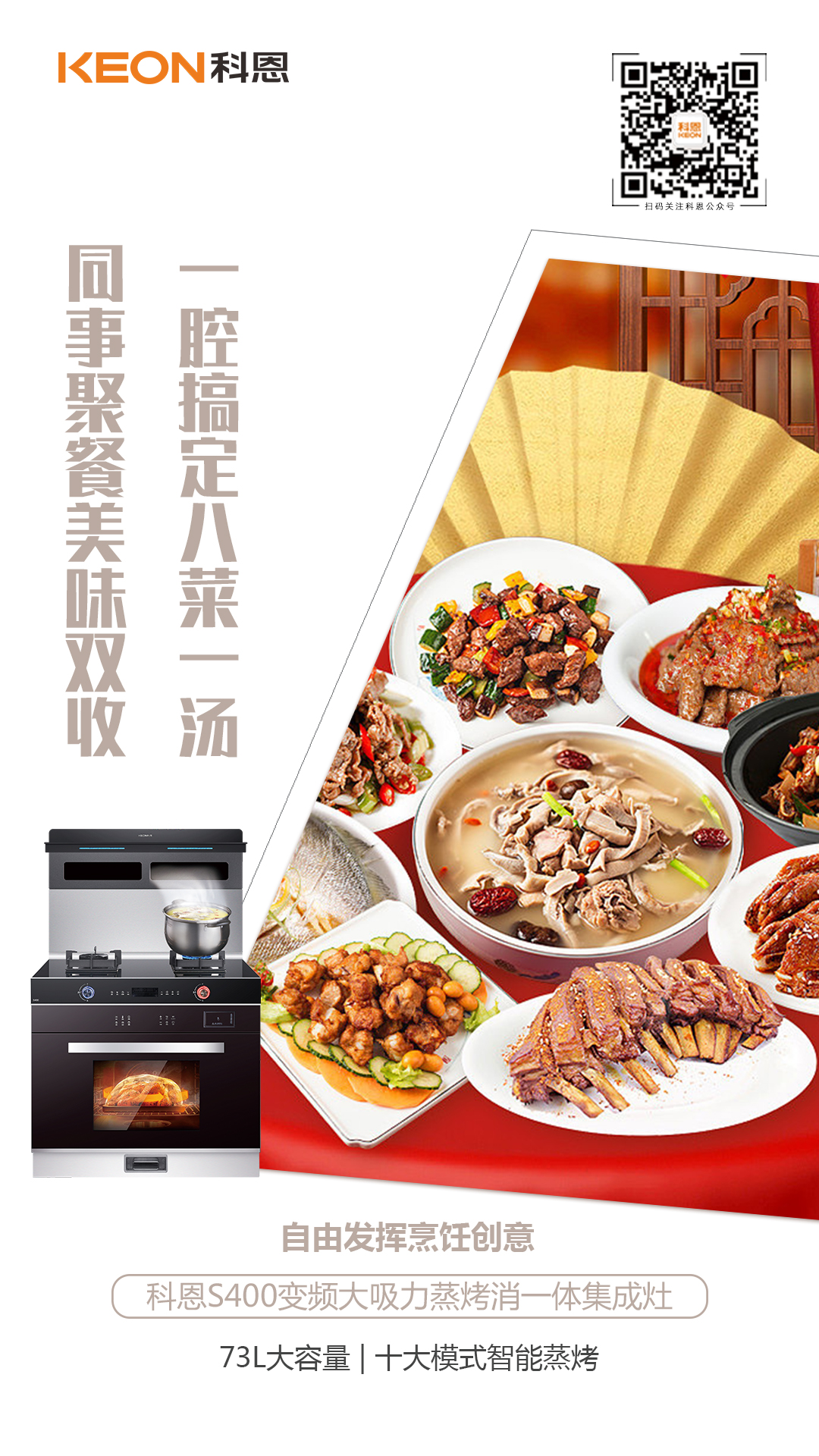 親友聚餐,想露一手奈何卻是廚房小白,是時候打開科恩S400, 享受一下“廚藝大師”的主角光環了!73L大容量可視腔體,從容面對家庭聚餐需求,一腔搞定八菜一湯,十大模式智能蒸烤,自由發揮烹飪創意,火候、溫度、時間,一鍵搞定!