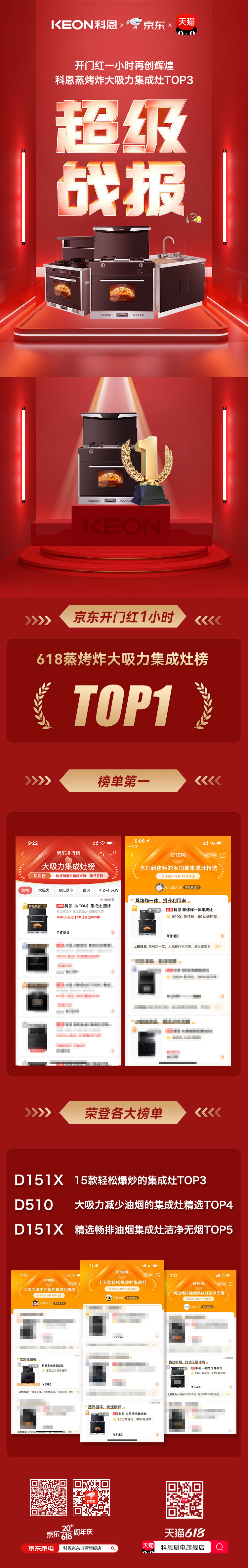 5月31日20:00,618開門紅正式開啟。在這場各大品牌的“首波交鋒”中,科恩集成灶表現尤為亮眼。截至5月31日21:00,科恩集成灶斬獲京東蒸烤炸大吸力集成灶TOP1,蟬聯第一!