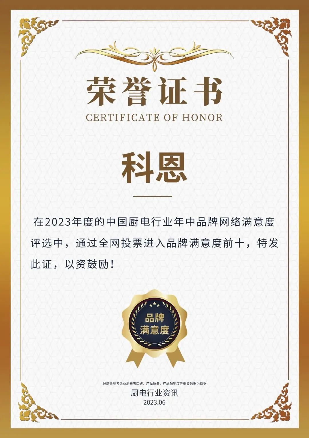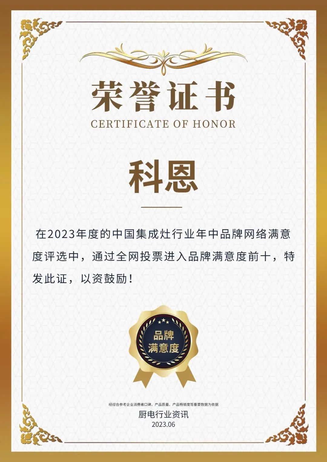 616日,浙江科恩電器有限公司再度榮獲“2023年度中國廚電行業(yè)品牌年中網(wǎng)絡(luò)滿意度前十“2023年度中國集成灶行業(yè)品牌年中網(wǎng)絡(luò)滿意度前十