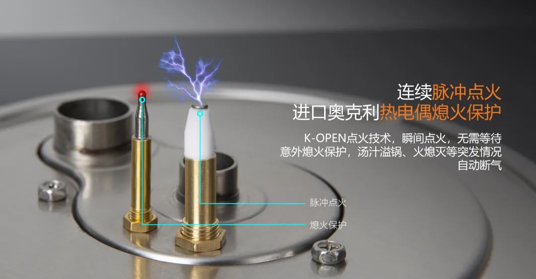 奧克利熄火針,意外熄火保護,湯汁溢鍋、火熄滅等自動斷氣,保障廚房安全。連續脈沖點火,瞬間點火,無需等待。