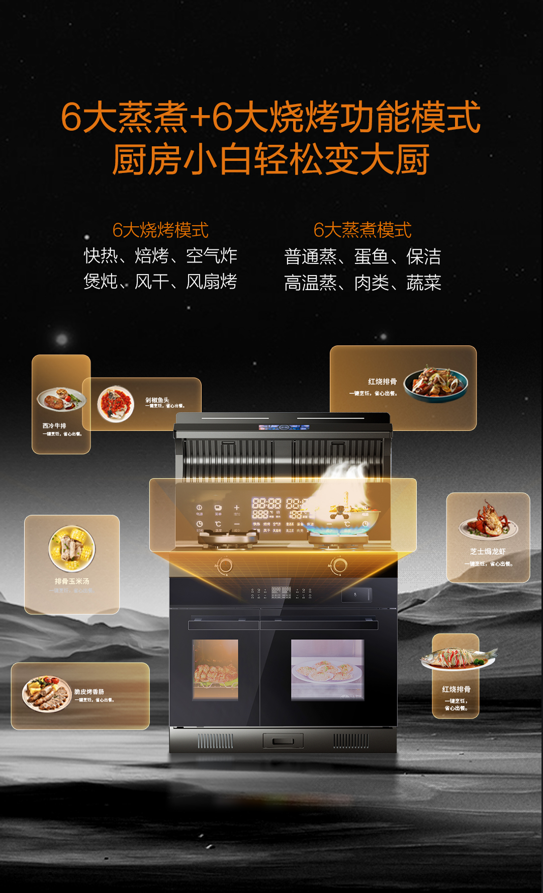 6大蒸煮模式+6大燒烤模式,內(nèi)置菜譜,一鍵直達(dá),美味可以更簡單。