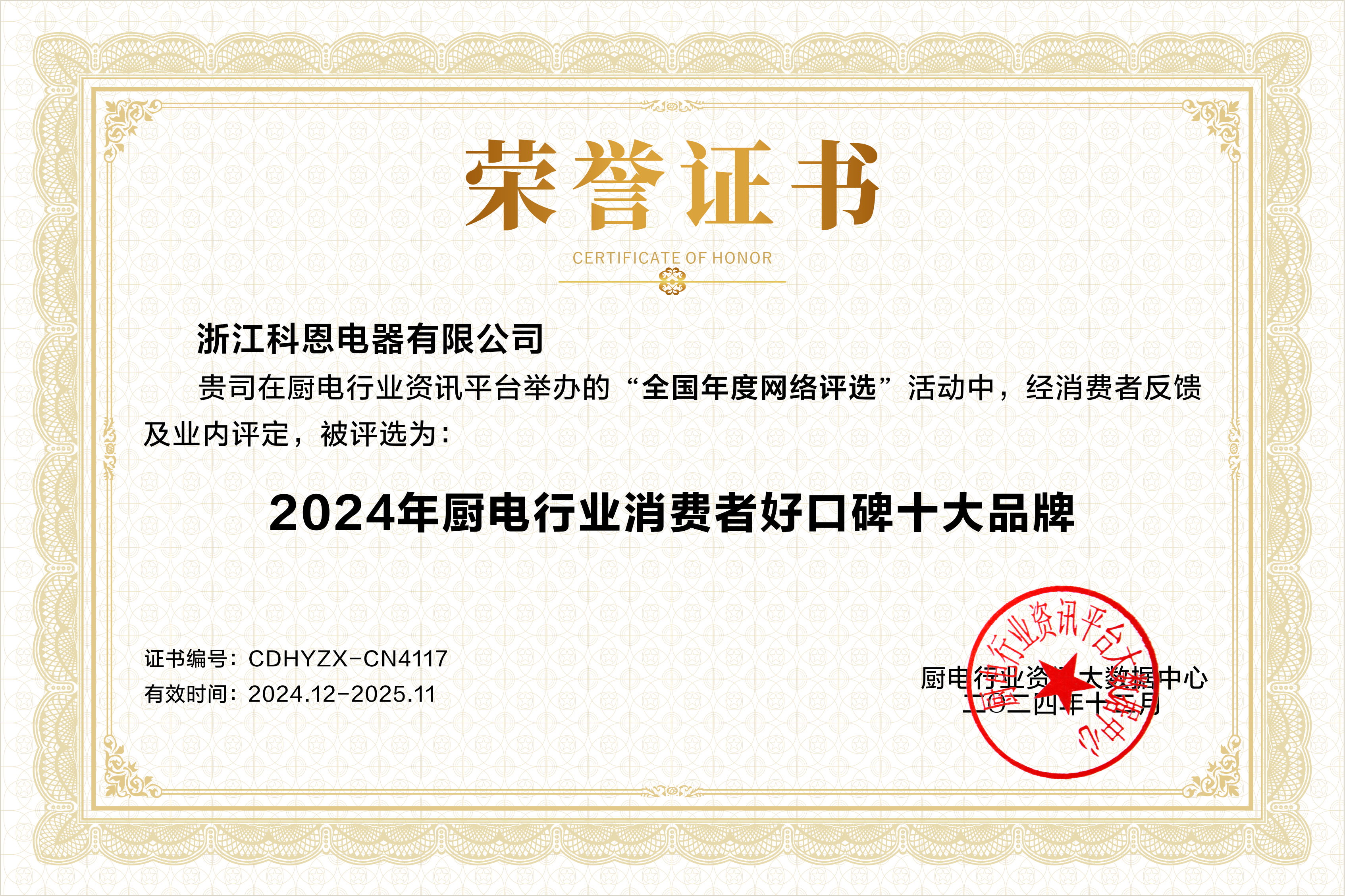 此次多項榮譽加身,對科恩電器而言既是鼓勵也是鞭策。未來,科恩電器有望憑借強大的研發實力和良好的用戶基礎,繼續深耕廚電市場,推出更多創新產品,進一步提升品牌競爭力,為消費者打造更加智能、便捷、高品質的廚房生活體驗,同時也為推動廚電行業的整體發展貢獻更多力量。