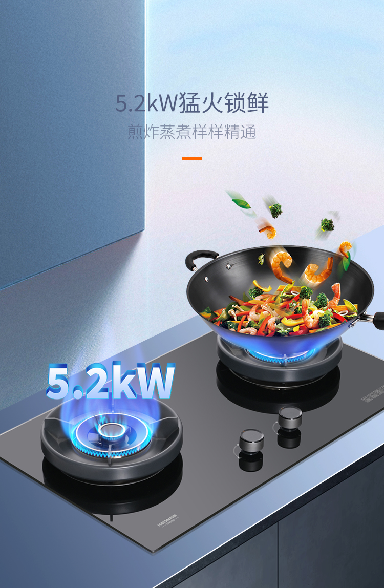 防滑防燙,操控舒心。黑色鏡面旋鈕設計,防滑紋路握感佳,防升溫隔熱源,烹飪操作不燙手,精準刻度標識,火力調節一目了然。0°-170°寬域控火,大小火候收放自如,煎炒烹炸燜煮燉,多種模式輕松應對,每一次調節,都精準契合烹飪需求。易拆易潔,省心省力。火蓋可拆卸設計,清潔無死角,爐頭部件易打理,油污無處藏匿,延長灶具使用壽命,長久保持良好狀態。黑色搪瓷鍋支架,防滑耐高溫不變形,日常擦拭即可光亮如新,無需復雜工序,清潔不再費時間,烹飪前后更輕松。聚能防風,火力強勁。立體聚能環加持,防風聚熱雙在線,鎖住熱量不流失,烹飪效率大提升,耐腐蝕不易變形,惡劣環境穩發揮,5.2kW猛火爆炒,火焰強勁氣足,激發食材本真色香味,在家吃出大廚味,高溫快炒不拖沓,美味無需久等。