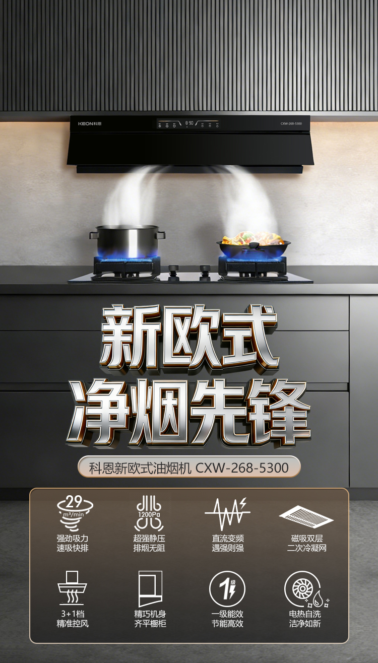 科恩新歐式凈煙先鋒5300,以勁風凈煙守護春日鮮氧,用嵌合美學點亮廚居風景。憑智能潔凈解鎖無憂時光,讓油煙隱于無形,讓美感融于日常,春日出廚有煙火,更有清歡,凈煙入畫,廚居煥新,這才是春日烹飪的理想模樣!