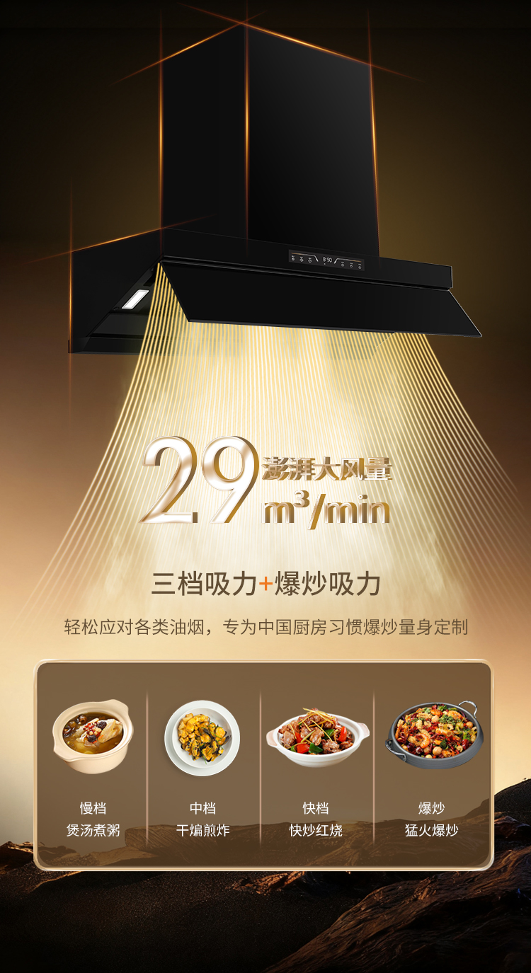 勁風攬煙,凈無痕跡。想爆炒香椿的鮮香,慢燉春筍的清甜?29m³/min澎湃大吸力,濃煙剛起即吸,1200Pa超強靜壓,突破煙道擁堵,直流變頻電機遇強則強,烹飪全程空氣清爽,告別油膩侵擾。