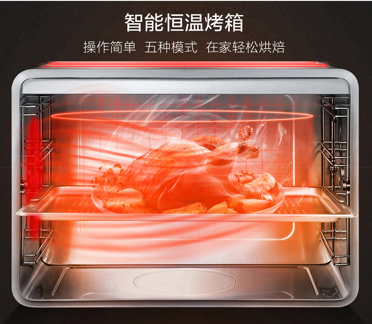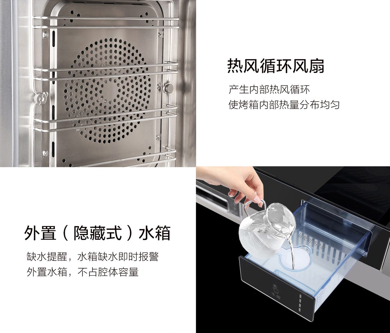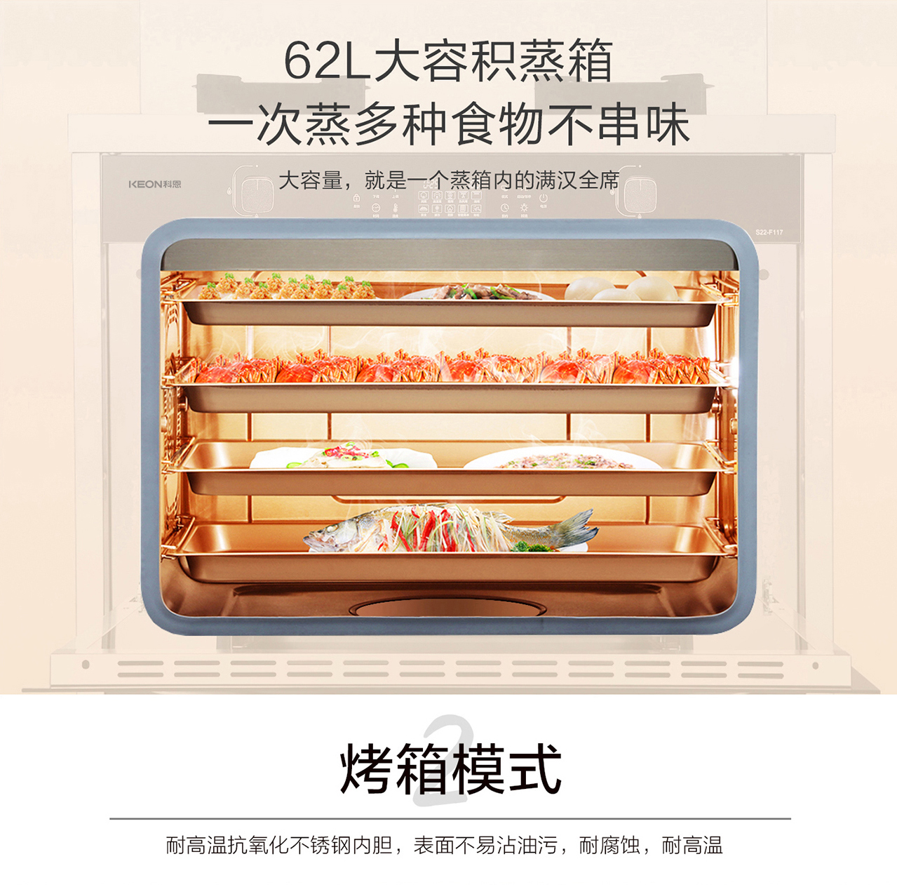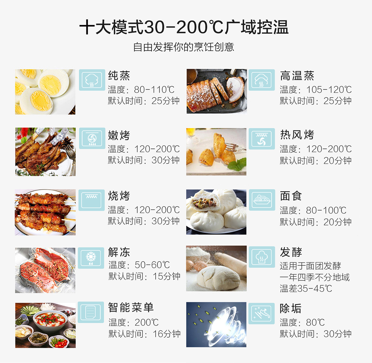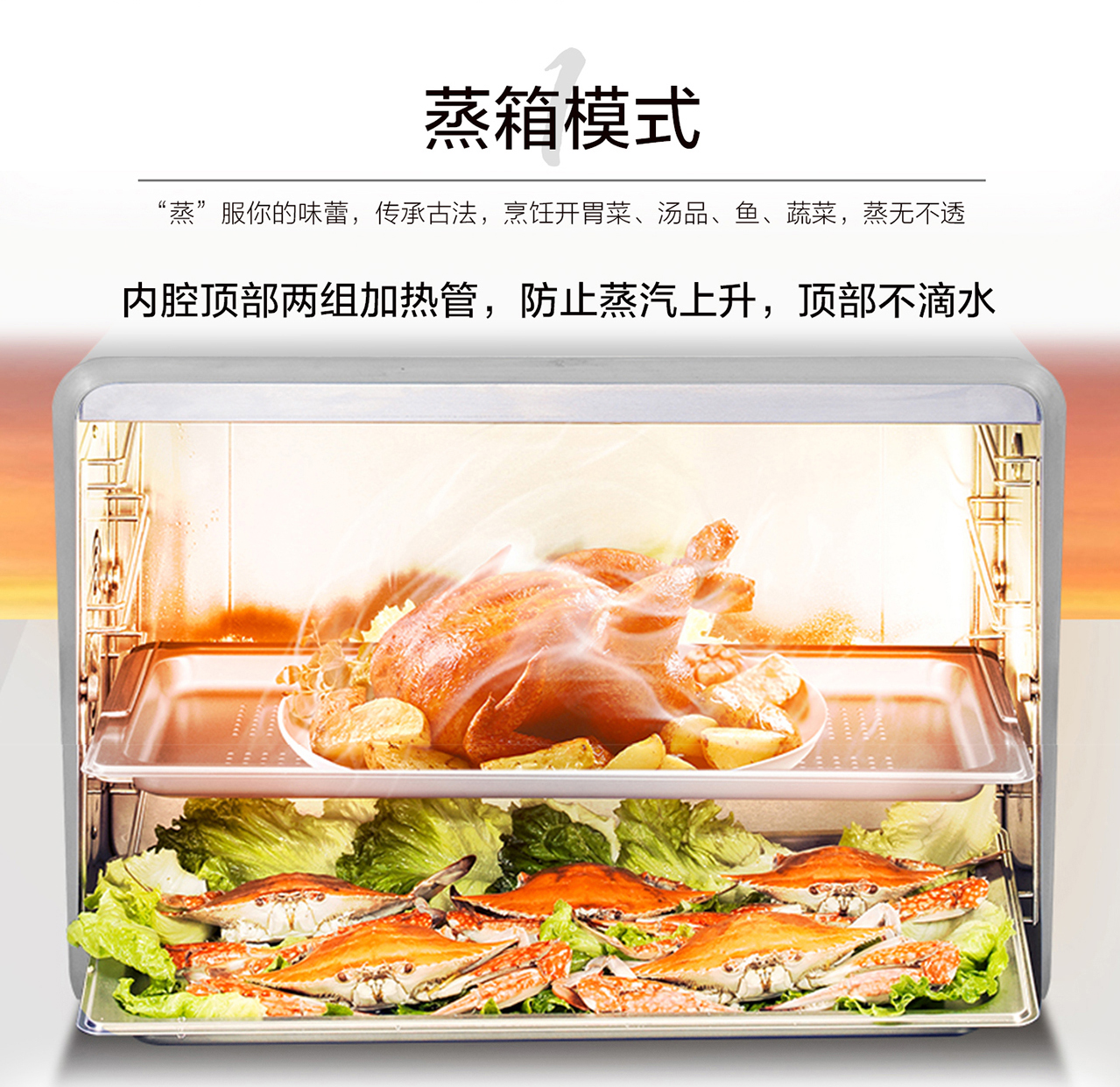 62L大容量食品級304不銹鋼內(nèi)膽,上下4層設(shè)計(jì),9種蒸烤模式。