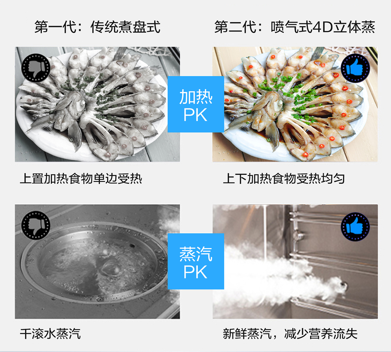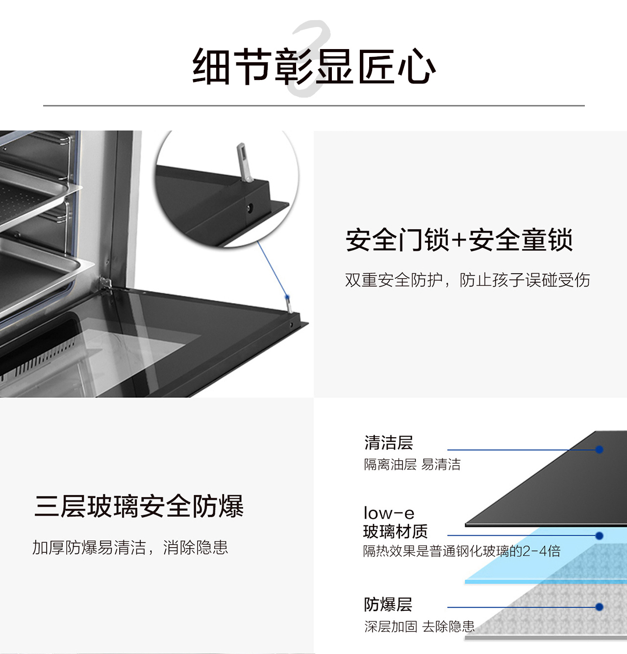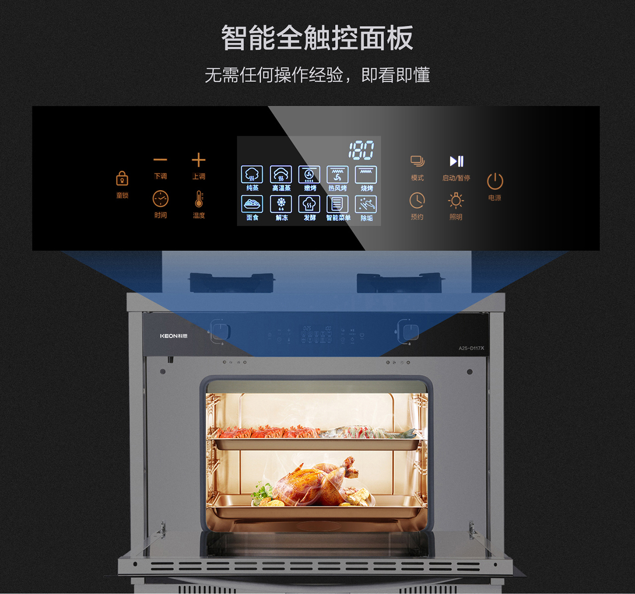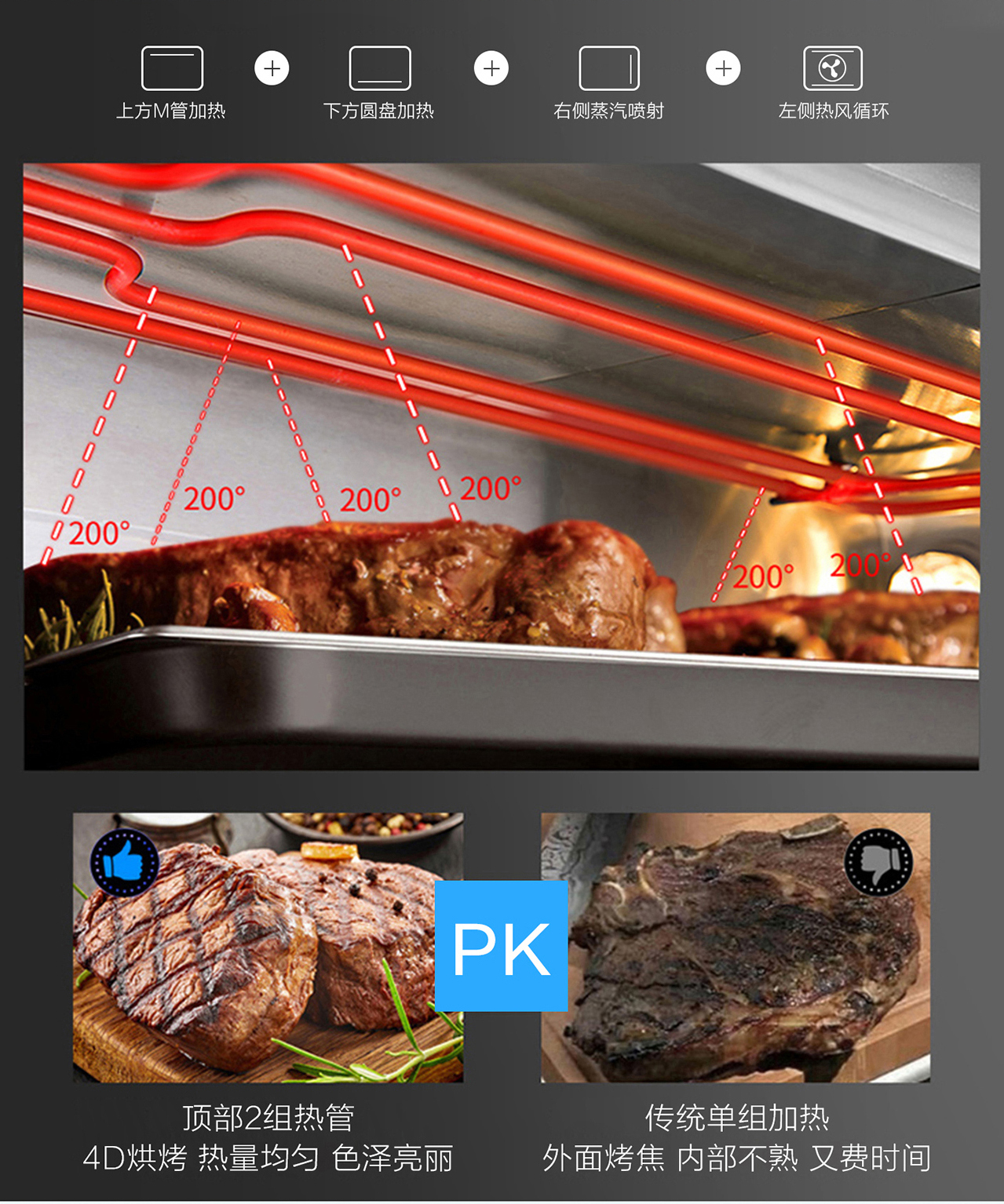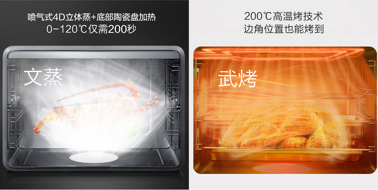 62L大容量食品級304不銹鋼內(nèi)膽,上下4層設(shè)計(jì),9種蒸烤模式。