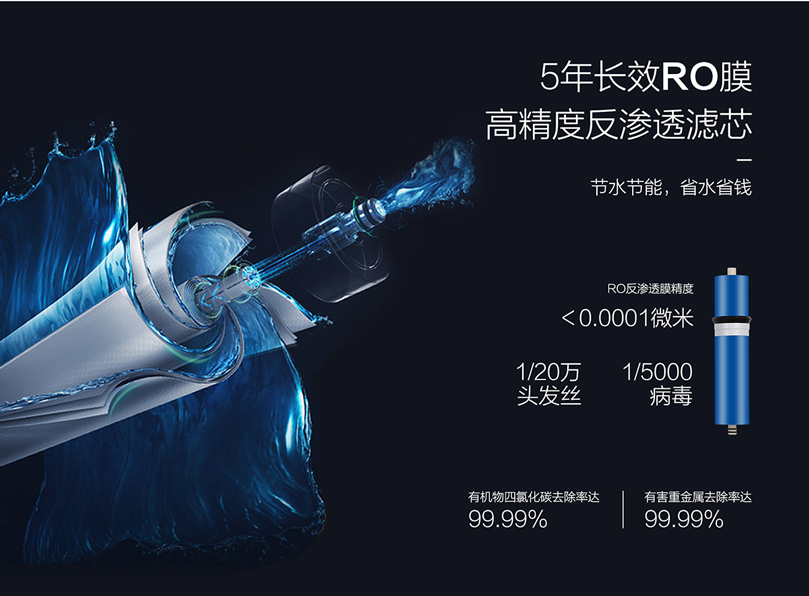 • 5年長(zhǎng)效RO膜,高精度反滲透濾芯