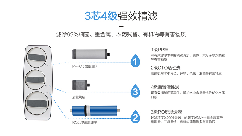 • 三芯四級(jí)強(qiáng)效精濾,濾除99%細(xì)菌重金屬