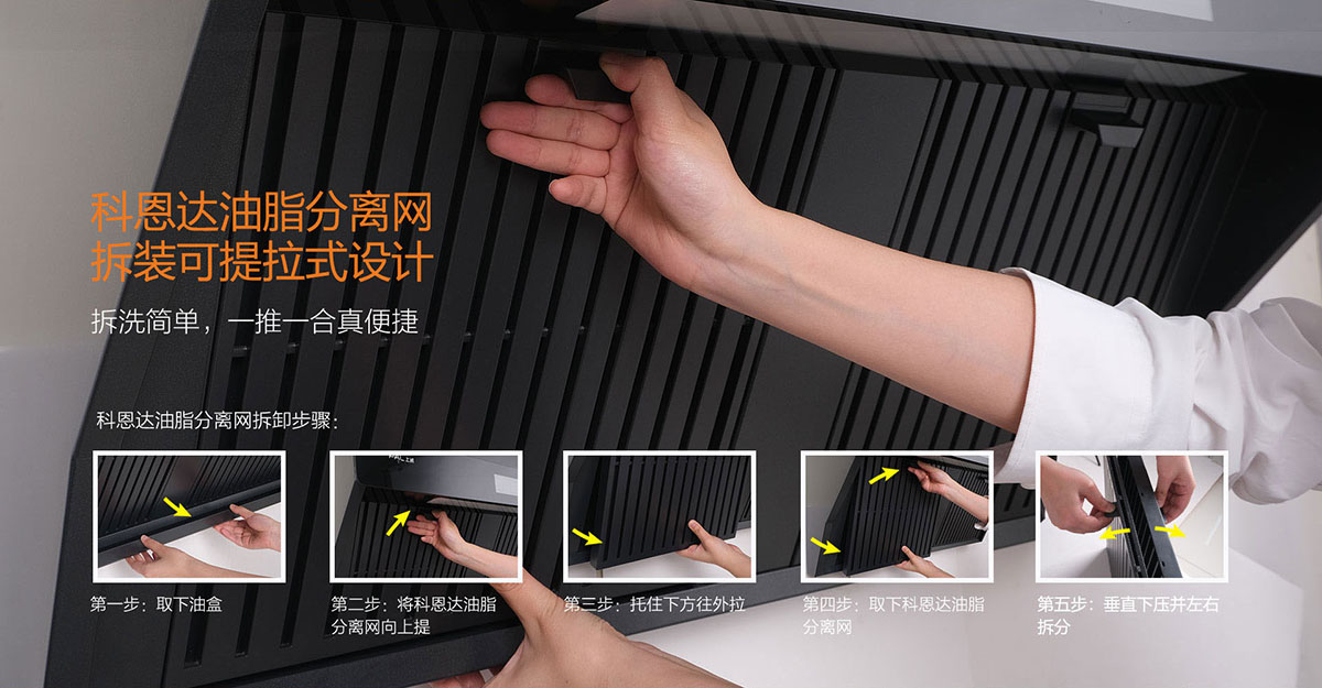 - 科恩達(dá)油脂分離網(wǎng)便捷拆裝設(shè)計(jì),表面易潔工藝,拆洗簡單