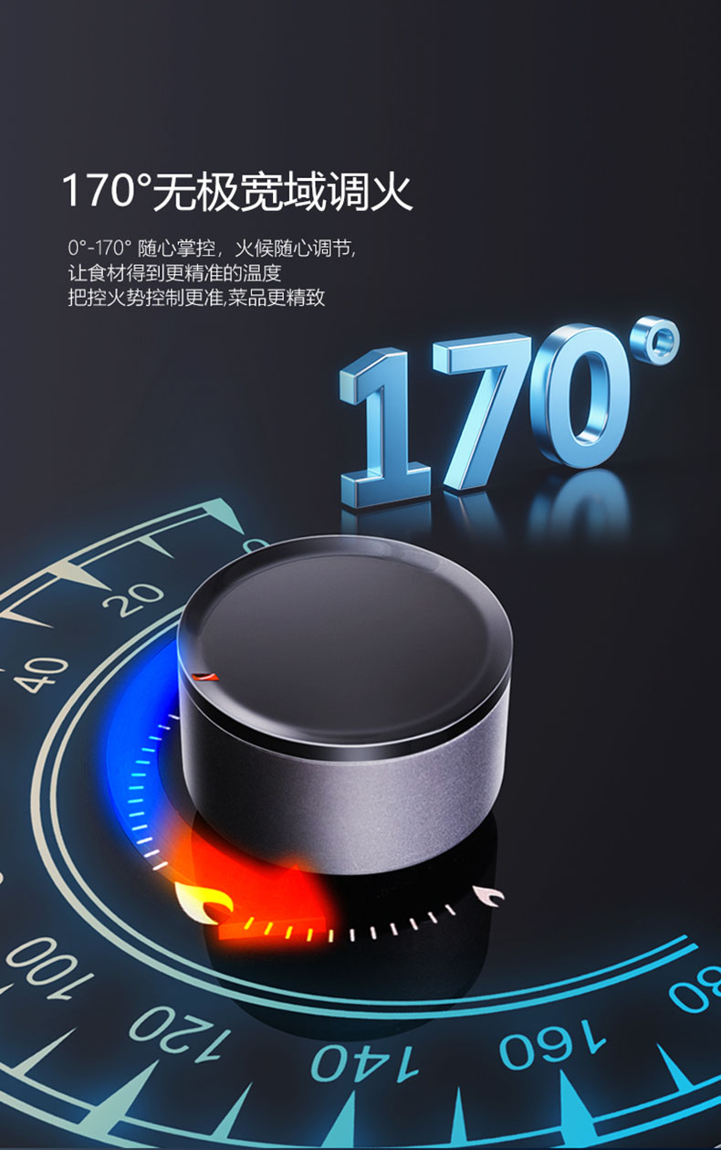 - 無(wú)極寬域調(diào)火,0°-170° 隨心掌控,火候自如